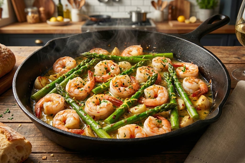 Plating & Garnish Spoon shrimp and asparagus onto warmed plates, letting glossy sauce pool underneath. Scatter bright parsley for freshness and a pinch of chili flakes for subtle heat. Serve with crusty bread to mop up every drop of buttery garlic essence.