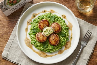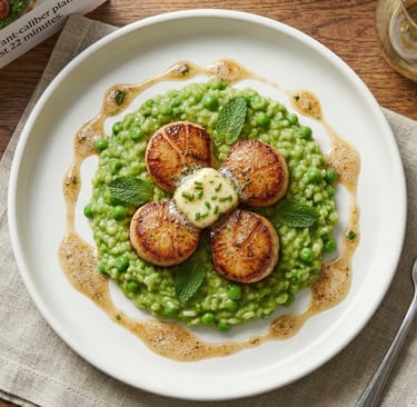 Perfectly seared scallops crowned with a whisper of garlic butter rest atop a vibrant green pea and mint risotto that stays creamy yet light. The sweet, briny scallops play against the bright, barely sweet peas, while a final drizzle of browned butter ties everything together with nutty elegance. A restaurant-caliber plate in just 22 minutes.